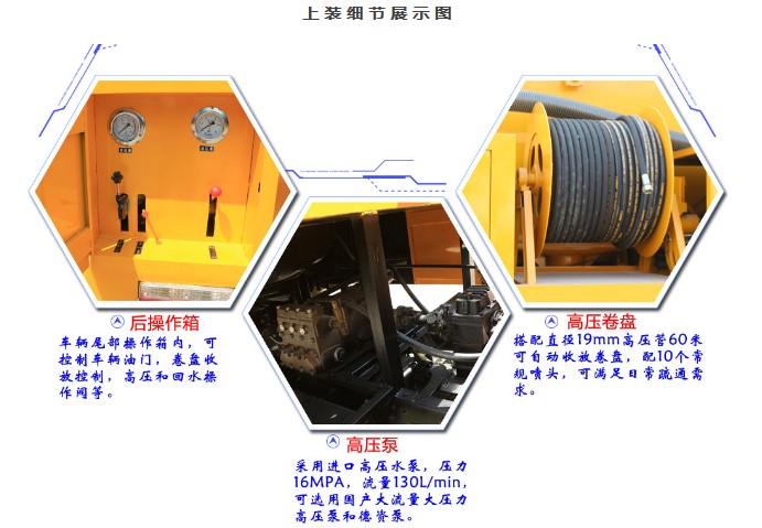 罐體采用國標優質碳鋼4mm制作,罐體有效容積為8-10立方。配備進口高壓泵(高壓泵壓 力:16Mpa 、流量:130L/min ),夾心取力器,卷簾門,齒輪泵,高壓三通,液壓閥,帶亮管,帶液壓卷盤,帶φ19MM專用高壓清洗管60米,帶10個高壓噴頭,帶消防接頭,帶警示燈!