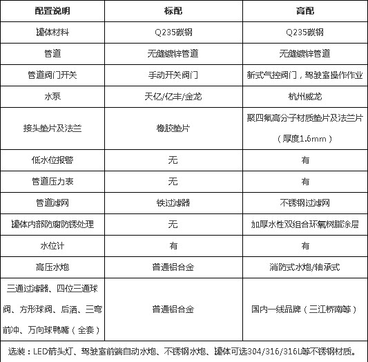 國六8-10噸解放虎VH灑水車選裝配置: