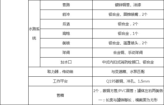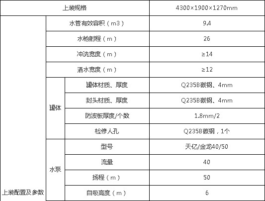 整車帶一個(gè)專用40/50大功率灑水泵(垂直最大吸程6米),多功能灑水車配備2個(gè)前沖(噴)(能將路面泥巴、塵土、垃圾沖干凈);前沖可沖洗約7-8車道,高炮射程26米,2個(gè)后灑(能均勻地將水灑在路面,一次灑水寬度14米)、2個(gè)側(cè)噴(花灑)(能均勻地將路旁綠化帶澆灌)、帶1個(gè)后工作平臺,平臺上安裝1個(gè)綠化灑水高炮(灑水炮可全方位旋轉(zhuǎn),可連續(xù)調(diào)成直沖狀、大雨、小雨、毛毛雨,霧狀可調(diào)節(jié)沖洗高大樹木),引水時(shí)間小于4min,流量40m3/h。帶1個(gè)消防接頭,帶1個(gè)自流閥,1個(gè)過濾裝置、人性化爬梯及側(cè)防護(hù)欄,安裝灑水音樂喇叭,配專用水泵(泵進(jìn)泵出)及消防栓接口,兩根等長輸水管,金屬漆,其余標(biāo)配。用戶可選裝消防大功率消防水泵、應(yīng)急時(shí)可做消防灑水車使用。